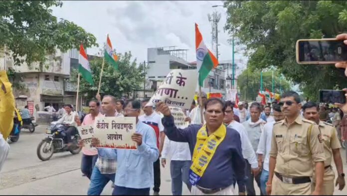 वर्धा :- लोकशाही बचाव अभियानातर्फे वर्ध्यात आक्रोश मोर्चा काढण्यात आलाय. मत चोरीच्या विरोधात छत्रपती शिवाजी महाराज चौकातून या मोर्चाला सुरुवात करण्यात आलीय. या मोर्चात राष्ट्रवादी काँग्रेस, काँग्रेस, सी पी आय , प्रहार अशा विविध संघटना यात सहभागी झाल्या आहेय. हातात तिरंगा घेत अनेकजण या मोर्चात सहभागी झाले आहेय.