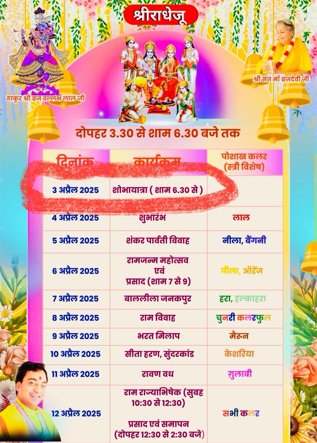 या धार्मिक महोत्सवाचा संकल्प गिरीजा विजयकुमारजी तेलवाले यांनी केला असून, सीए अजय अग्रवाल, सीए अमर अग्रवाल यांच्या संयुक्त आयोजनाखाली हा कार्यक्रम पार पडणार आहे. दिनांक ३ एप्रिल रोजी संध्याकाळी ६:३० वाजता संतांच्या आगमनानंतर भव्य शोभायात्रेने सुरुवात होईल. रामकथा ४ एप्रिलपासून दररोज दुपारी ३:३० ते संध्याकाळी ६:३० वाजेपर्यंत वाचली जाणार आहे. समारोप १२ एप्रिल रोजी सकाळी १०:३० ते दुपारी १:३० या वेळेत होणार आहे.