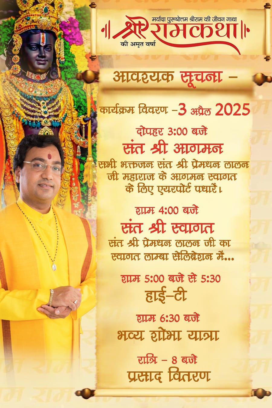श्री प्रेमधन लालनजी महाराज हे देशविदेशात कथा-कीर्तनाचे सेवाकार्य करतात. याप्रसंगी संपूर्ण अग्रवाल कुटुंबीयांनी नागपूरकरांना उपस्थित राहून रामकथेचा लाभ घेण्याचे आवाहन केले आहे.