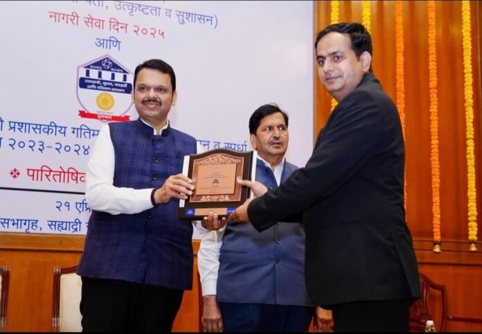 (Chandrapur)चंद्रपूर 22 एप्रिल :- चंद्रपूर महानगरपालिकेमध्ये राबवलेल्या नागरी उपक्रमांसाठी आयुक्त तथा प्रशासक विपीन पालीवाल यांना राजीव गांधी गतिमान प्रशासन पुरस्कार 2023-24 आणि 2024-25 या वर्षातील दोन पुरस्कारांद्वारे मुंबई येथे माननीय मुख्यमंत्री देवेंद्रजी फडणवीस यांच्या हस्ते नागरी सेवा दिनानिमित्त सन्मानित करण्यात आले.