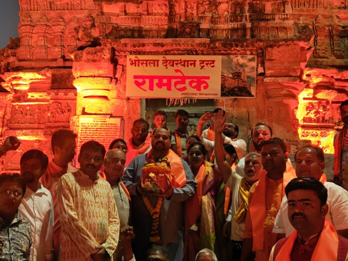 त्यानंतर गांधी चौक ते गडमंदिर अशी भव्य शोभायात्रा काढण्यात आली. या शोभायात्रेत हजारोंच्या संख्येने भाविक उपस्थित होते. शोभायात्रेच्या मार्गावर रांगोळ्या काढण्यात आल्या होत्या. महिलांनी या पवित्र जलाचे ओवाळून स्वागत केले व पुष्पवृष्टी केली. 13 फेब्रुवारी रोजी रामटेक गडमंदिरात प्रभू श्रीरामाला या पवित्र जलाद्वारे अभिषेक केला जाणार आहे. त्यानंतर हे पवित्र जल कलश नागपूरकडे रवाना होणार असून सकाळी 8 वाजता कल्याणेश्वर मंदिर, तेलंगखेडी येथे येणार आहे.