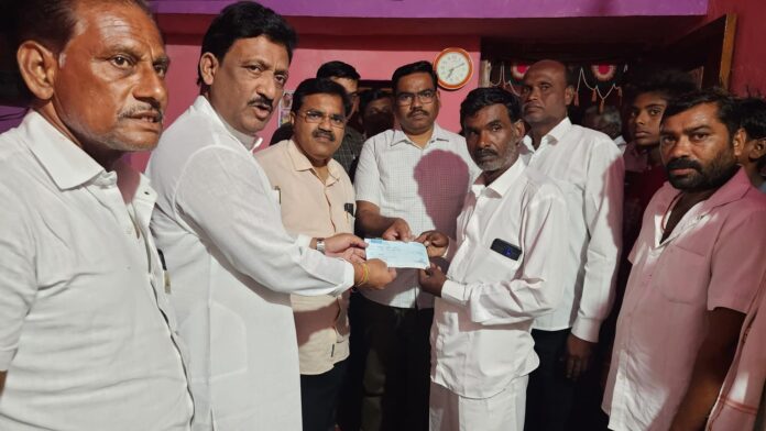 वर्धा : मागील महिन्यात मुसळधार पावसात भिवापूर येथील ठाकरे कुटुंबीयांवर दुःखाचं डोंगर कोसळला अचानक आलेल्या पावसात वीज पडून अनिल दत्तुजी ठाकरे आणि सौरभ गजानन ठाकरे यांचा दुर्दैवी मृत्यू झाला. घटनेची शासनाने दखल घेऊन त्यांच्या कुटुंबियांना आर्थिक मदत म्हणून प्रत्येकी चार लाख रुपये आमदार राजेश बकाने यांच्या हस्ते देण्यात आले.
