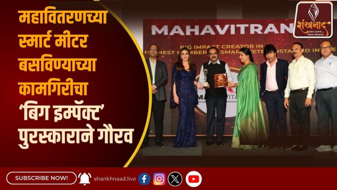 नागपूर(Nagpur), दि. 26 फेब्रुवारी 2026: सर्वाधिक अत्याधुनिक स्मार्ट मीटर बसवून देशात प्रथम क्रमांक पटकावण्याच्या महाराष्ट्राच्या कामगिरीत मोलाचा वाटा उचलणाऱ्या महावितरणचा ‘बिग इम्पॅक्ट’ पुरस्काराने मुंबई(Mumbai) येथे बुधवारी (25 फेब्रुवारी) गौरव करण्यात आला. मुंबईतील सहारा स्टार हॉटेलमध्ये आयोजित या कार्यक्रमात 92.7 बिग एफएम या लोकप्रिय रेडिओ चॅनलच्या वतीने विविध क्षेत्रात कल्पकता व नाविन्यपूर्ण उपक्रमाद्वारे समाजावर सकारात्मक प्रभाव टाकणाऱ्या व्यक्ती आणि संस्थांचा पुरस्काराने गौरव करण्यात आला.