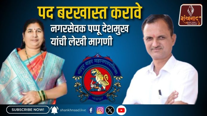 आज चंद्रपूर शहर महानगरपालिकेच्या सर्वसाधारण सभेमध्ये महापौर सौ. संगीता राजेंद्र खांडेकर यांचे पद बरखास्त करण्याची मागणी महानगर आघाडीचे गटनेचे नगरसेवक पप्पू देशमुख यांनी केली. यासंदर्भात सविस्तर निवेदन सभागृहात सादर करून ते आयुक्तांच्या मार्फत शासनाकडे पाठविण्याची मागणी त्यांनी केली. याबाबत सर्वसाधारण सभेत बोलतांना देशमुख यांनी महापौर यांनी कर्तव्यात कसूर केल्याचा तसेच नियमाचा भंग केल्याचा आरोप केला.
