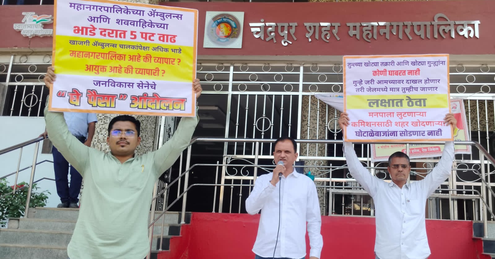१ एप्रिल २०२५ पासून चंद्रपूर महानगरपालिकेने ॲम्बुलन्स,शव वाहिका, पाण्याचे टँकर इत्यादी मूलभूत सेवांच्या दरात मोठी वाढ केली. या दरवाढीने संतप्त झालेल्या जनविकास सेनेने संस्थापक अध्यक्ष पप्पू देशमुख यांचे नेतृत्वात पुन्हा एकदा आयुक्तांच्या गाडीवर नोटांची उधळण करण्याचा प्रयत्न केला. मात्र आयुक्त व त्यांची गाडी नसल्याने यावेळी उपायुक्त मंगेश खवले यांच्या गाडीवर नोटा उधळण्यात आल्या.