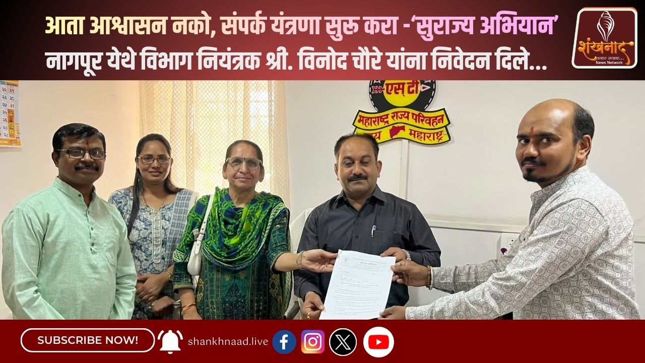 नागपूर(Nagpur) येथे विभाग नियंत्रक श्री. विनोद चौरे रा. प. नागपूर यांना निवेदन देण्यात आले. यावेळी सुराज्य अभियान जिल्हा समन्वयक श्री. योगेश काटकर, हिंदू जनजागृती समितीचे समन्वयक व अन्य उपस्थित होते. निवेदनातील सगळ्या मागण्या रास्त आहेत व त्याबद्दल आम्ही आमच्या वतीने पुढे या संदर्भात योग्य ती उपाययोजना करावी असं कळवू असे आश्वासन श्री. विनोद चौरे दिले.