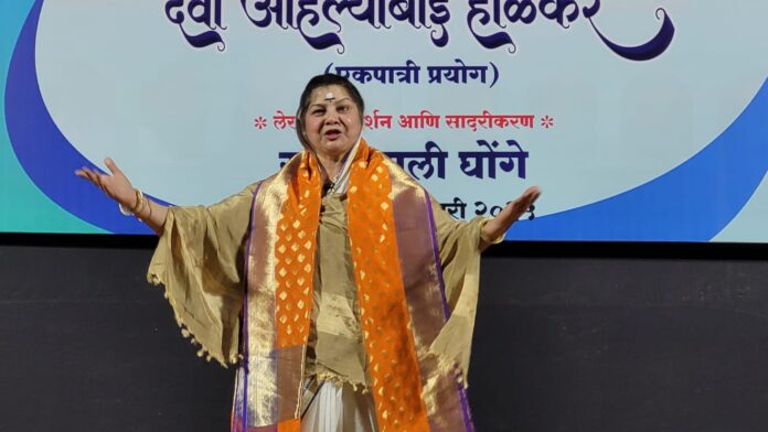 पुण्यश्लोक अहिल्यादेवी होळकर (Punyashloka Ahilyadevi Holkar) यांनी आपल्या कर्तृत्वाने राज्यकारभाराचा, कठोर प्रशासनाचा आणि मूल्यसंवर्धनाचा उच्चतम आदर्श घालून दिला. राज्याचे रक्षण करणाऱ्या शस्त्रावर आणि संस्कृतीचे रक्षण करणाऱ्या शास्त्रावर त्यांचा विश्वास होता. राज्यकारभार करताना त्यांनी नात्यागोत्यांपेक्षाही नीतीमत्तेला महत्त्व दिले. स्त्रीचा पदर फार महत्त्वाचा असतो. ‘पदर घे, पदरात घे, प्रसंगी पदर खोच, पदरमोड कर परंतु स्वाभिमानाचे प्रतीक असणारा हा पदर कोणाहीसमोर पसरू नको’ हे आशीर्वाद म्हणून मिळालेले शब्द त्यांनी जिवापाड जपले. मोडकळीस आलेल्या असंख्य मंदिरांचा जीर्णोद्धार करणाऱ्या अहिल्यादेवींचे जीवन म्हणजे हिंदुत्वाचा आणि स्त्रीत्वाचा धगधगता इतिहास आहे, असे प्रतिपादन नागपूर येथील सुप्रसिद्ध रंगकर्मी तथा संस्कार भारतीच्या विदर्भ प्रांत मंचीय कला सहसंयोजक दीपाली घोंगे यांनी आपल्या एकपात्री प्रयोगाद्वारे येथे केले.