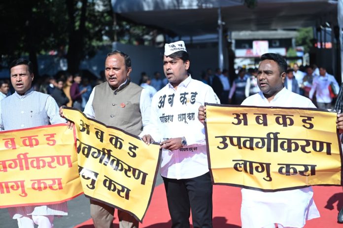 समाजाच्या न्याय्य हक्कांसाठी राज्य सरकारने तत्काळ अबकड आरक्षणाबाबत निर्णय घ्यावा, या मागणीसाठी आज नागपुरात विधानभवनाच्या पायऱ्यांवर जोरदार आंदोलन करण्यात आले.