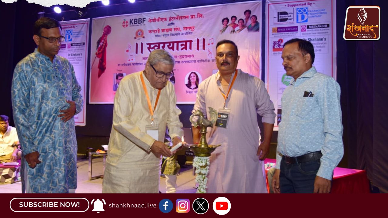 नागपूर, १८ मार्च : केबीबीएफ इंटरनॅशनल प्रा. लि. आणि कऱ्हाडे ब्राह्मण संघ, नागपूर यांच्या संयुक्त विद्यमाने गुढी पाडव्याच्या पूर्वसंध्येला ‘स्वरयात्रा’ या विशेष संगीत कार्यक्रमाचे आयोजन करण्यात आले. हा कार्यक्रम बुधवारी शंकरनगर येथील साई सभागृहात उत्साहात पार पडला. कार्यक्रमाला प्रेक्षकांचा उत्स्फूर्त प्रतिसाद लाभला. टाळ्या आणि शिट्यांच्या गजरात कलाकारांचे कौतुक करण्यात आले. प्रेक्षक मंत्रमुग्ध झाले.