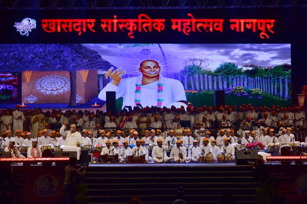 आधुनिक काळातील महान संत, समाजसुधारक आणि राष्ट्रीय एकात्मतेचे प्रणेते राष्ट्रसंत तुकडोजी महाराजांचे जीवन, समाजप्रबोधनाचे कार्य, ग्रामविकास, राष्ट्रप्रेम, साहित्य, खंजिरी भजन आदींवर प्रकाश टाकणारे नृत्य, नाट्य, भजन आदी लोककलांच्या माध्यमातून 2000 कलाकारांनी राष्ट्रसंताना अभिवादन केले. हनुमाननगरातील क्रीडा चौक येथील ईश्वर देशमुख शारीरिक शिक्षण महाविद्यालयाच्या पटांगणावर सुरू असलेल्या खासदार सांस्कृतिक महोत्सव-2025’च्या चौथ्या दिवशी सायंकाळच्या सत्रात वंदनीय राष्ट्रसंत तुकडोजी महाराजांच्या जीवनावर आधारित दृक श्राव्य संगीतमय कार्यक्रम ‘राष्ट्रसंतांची जीवनगाथा’ कार्यक्रम पार पडला. भगव्या टोप्या परिधान केल्या राष्ट्रसंतांच्या भक्तांनी परिसर भगवामय झाला होता.