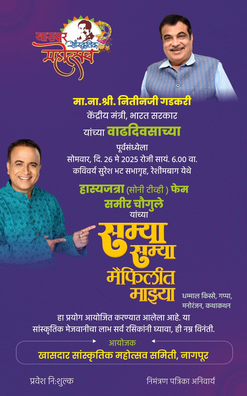 Cultural Festival : खासदार सांस्कृतिक महोत्सव (MP Cultural Festival) समितीच्या वतीने, केंद्रीय मंत्री मा. श्री. नितीन गडकरी यांच्या वाढदिवसाच्या पूर्वसंध्येला म्हणजे सोमवार, २६ मे २०२५ रोजी सायंकाळी ६ वाजता कविवर्य सुरेश भट सभागृह, रेशीमबाग, नागपूर येथे सोनी टीव्हीचा लोकप्रिय कार्यक्रम ‘हास्यजत्रा’ फेम सुप्रसिद्ध अभिनेते, लेखक समीर चौगुले यांची ‘सम्या सम्या मैफिलीत माझ्या’ ही विशेष हास्यसंध्या आयोजित करण्यात आली आहे.