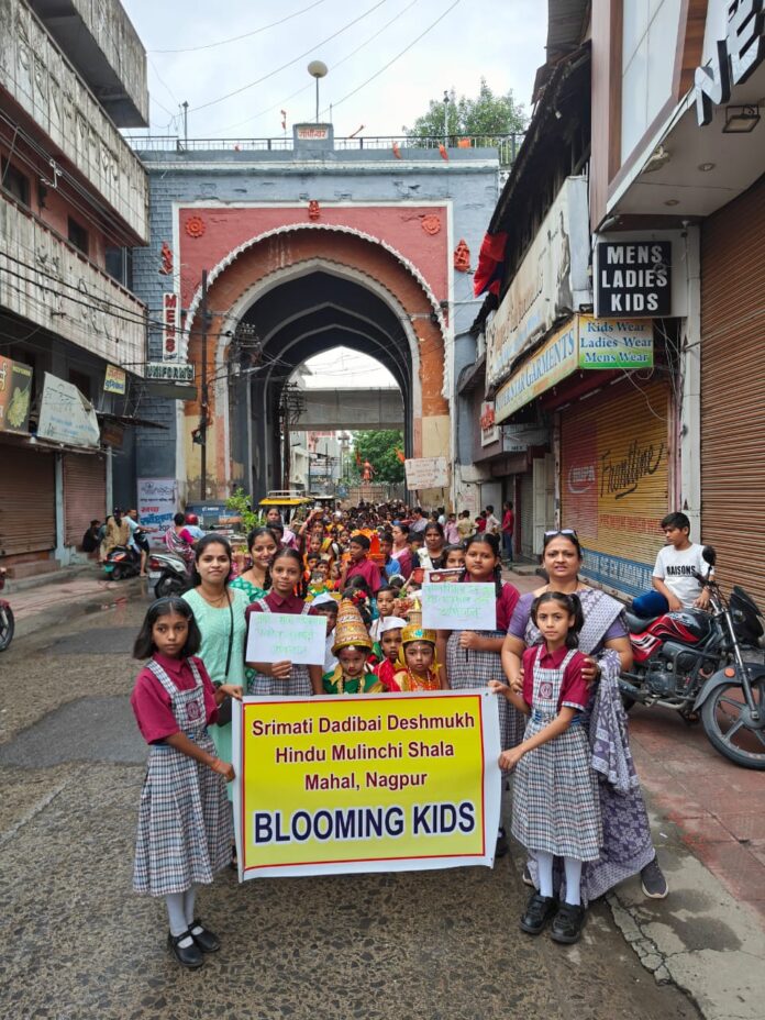 नागपूर, (Nagpur):- श्रीमती दादी बाई देशमुख हिंदू मुलींच्या शाळेत आषाढी एकादशी(Ashadhi Ekadashi) निमित्त दिंडीचे आयोजन करण्यात आले. मुलांना धार्मिक परंपरांची माहिती मिळावी, महाराष्ट्राची सांस्कृतिक ओळख जतन व्हावी, या उद्देशाने हा उपक्रम राबविण्यात आला. विद्यार्थी पारंपरिक वेशभूषेत या दिंडीत सहभागी झाले. विठ्ठल-नामाचा गजराने सारा परिसर दुमदुमून गेला. या उपक्रमाला अध्यक्षांच्या प्रतिनिधी सीमा फडणवीस, प्राथमिक विभागाच्या मुख्याध्यापिका वंदना वनकर, सर्व शिक्षक वृंद उपस्थित होते.