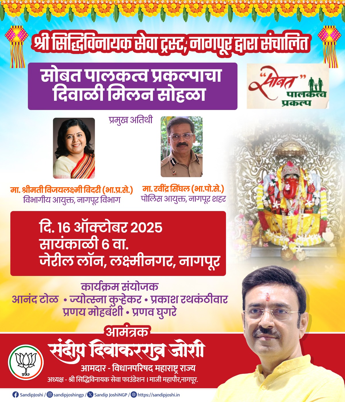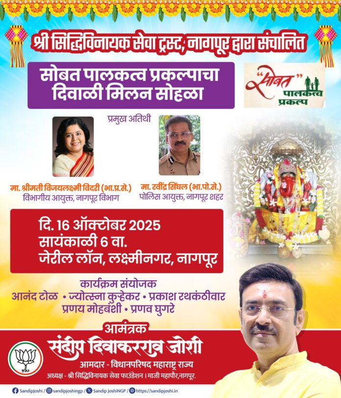 नागपूर : श्री सिद्धिविनायक सेवा ट्रस्ट, नागपूर संचालित ‘सोबत पालकत्व प्रकल्प’ तर्फे उद्या, 16 ऑक्टोबर रोजी सायंकाळी 7 वाजता लक्ष्मीनगरातील जेरील लॉन येथे दिवाळी मिलन सोहळ्याचे आयोजन करण्यात आले आहे.