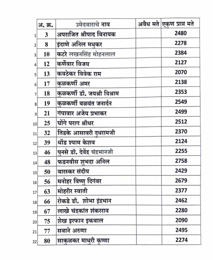 सोमवारी उशिरापर्यंत चाललेल्या या निवडणुकीच्या मतमोजणीचा अधिकृत निकाल निवडणूक निर्णय अधिकाऱ्यांनी सोमवारी जाहीर केला त्यात पत्रकार श्रीपाद अपराजित यांचा अपवाद वगळता उर्वरित 21 उमेदवार सृजनसेतू पॅनलचे निवडून आले आहेत. एकूण 83 उमेदवार या निवडणुकीच्या मैदानात उतरले होते.