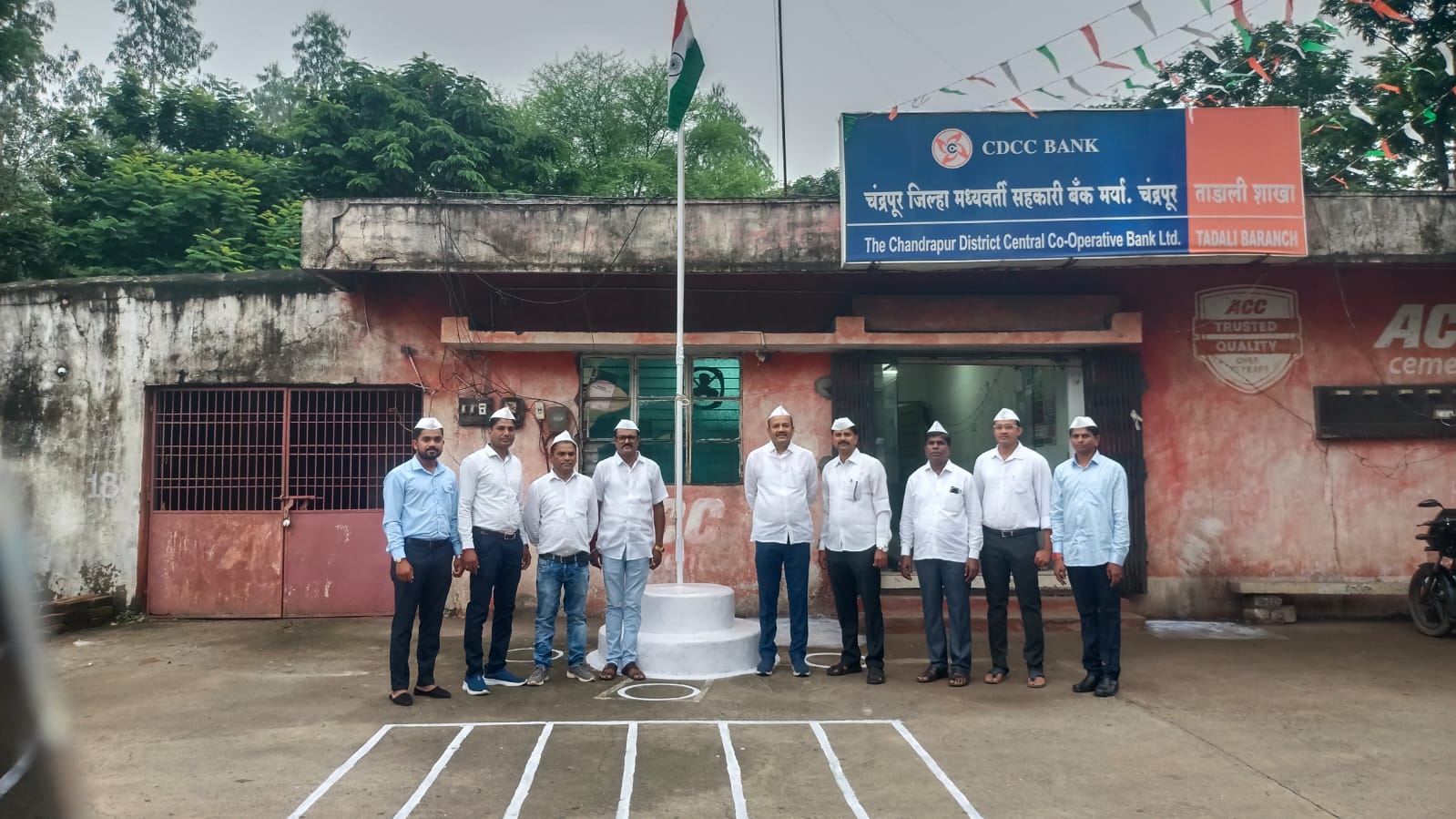स्वातंत्र्य दिनाच्या औचित्याने चंद्रपूर जिल्हा मध्यवर्ती सहकारी बँक शाखा ताडाळी येथे आज सकाळी राष्ट्रध्वजाचे विधीपूर्वक ध्वजारोहण करण्यात आले. जिल्हा मध्यवर्ती बँकेचे संचालक, काँग्रेस पक्षाचे ज्येष्ठ नेते, कृषी उत्पन्न बाजार समितीचे माजी सभापती, दिनेश दादापाटील चोखारे यांच्या हस्ते ध्वजारोहण करण्यात आले. यावेळी बँकेचे शाखा व्यवस्थापक सुरेश निखाडे यांची प्रामुख्याने उपस्थिती होती.