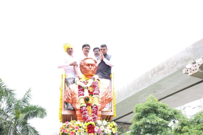 मुंबई (Mumbai) दि. १ :- लोकशाहीर अण्णा भाऊ साठे यांच्या १०५ व्या जयंतीनिमित्त, चेंबूर येथील चिरागनगर येथे उभारण्यात आलेल्या त्यांच्या पुतळ्यास राज्य अनुसूचित जाती जमाती आयोगाचे उपाध्यक्ष धर्मपाल मेश्राम (Dharmapal Meshram) यांनी पुष्पहार अर्पण करून अभिवादन केले.