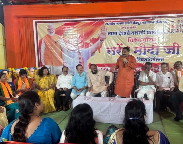यावेळी आमदार किशोर जोरगेवार, चंद्रपूर महानगर अध्यक्ष सुभाष कासनगोट्टूवार, महिला आघाडी अध्यक्षा छबु वैरागडे, भाजप नेते प्रकाश देवतळे, माजी महापौर राखी कंचर्लावार, संजय कंचर्लावार, युवा मोर्चा प्रदेश उपाध्यक्ष रघुवीर अहिर, युवा मोर्चा शहराध्यक्ष मयुर हेपट, विधानसभा अध्यक्ष दशरथसिंह ठाकूर, महामंत्री मनोज पाल, सविता दंढारे, मंडळ अध्यक्ष सुभाष अदमाने, स्वप्निल डुकरे, अॅड. सारिका संदुरकर, प्रदीप किरमे, ओबीसी आघाडी अध्यक्ष विनोद शेरखी, अल्पसंख्याक आघाडी अध्यक्ष राशिद हुसेन, अॅड. सुरेश तालेवार माजी नगरसेवक देवानंद वाढई, माजी नगरसेविका कल्पना बबुलकर, पुष्पा उराडे, वंदना तिखे, विठ्ठल डुकरे, अरुण तिखे, सायली येरणे आदींची प्रामुख्याने उपस्थिती होती.