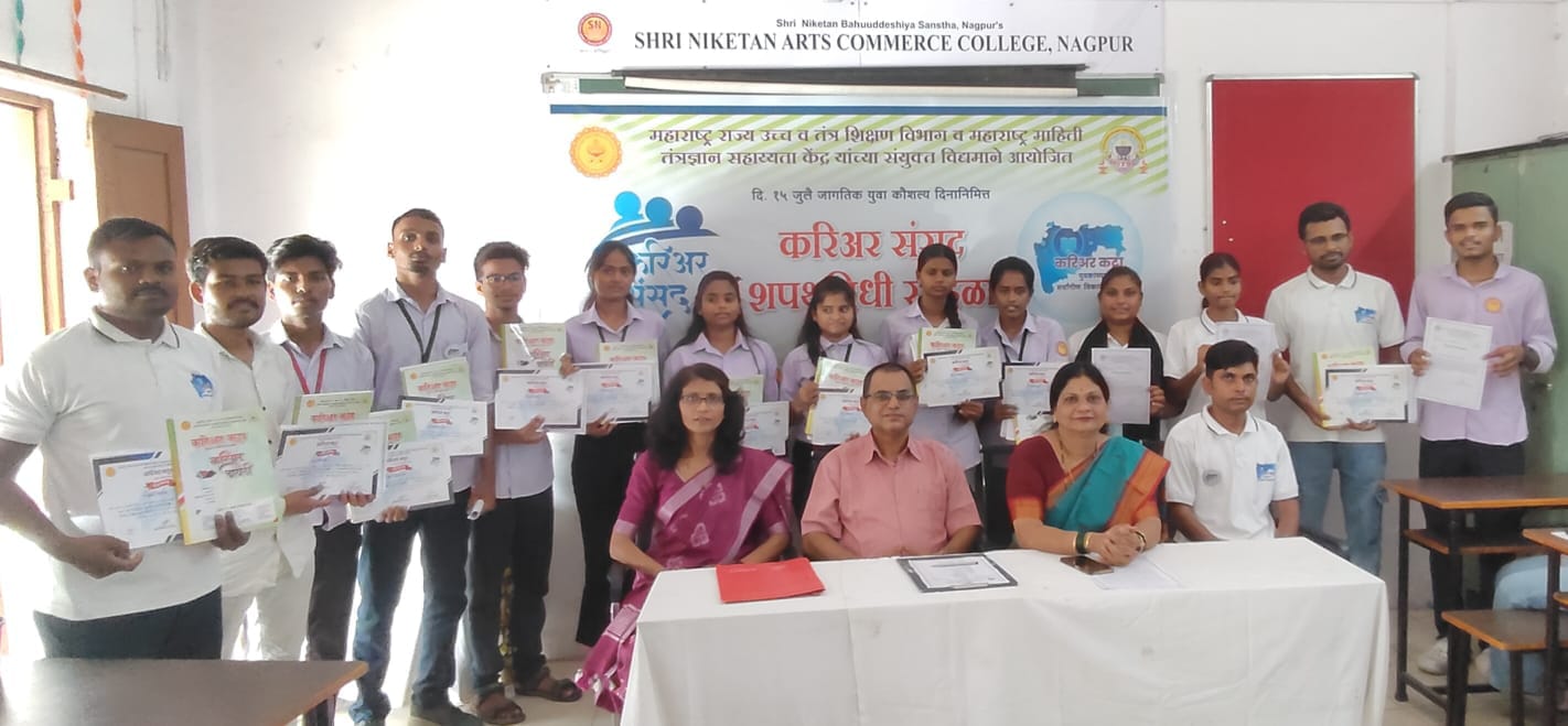 महाराष्ट्र राज्य उच्च व तंत्र शिक्षण विभाग व महाराष्ट्र माहिती तंत्रज्ञान सहाय्यता केंद्र यांच्या संयुक्त विद्यमाने राबविण्यात येणाऱ्या “करिअर कट्टा” या उपक्रमांतर्गत श्रीनिकेतन आर्ट्स अॅण्ड कॉमर्स महाविद्यालय, नागपूर येथे करिअर संसद पदाधिकाऱ्यांचा शपथविधी सोहळा मोठ्या उत्साहात पार पडला.