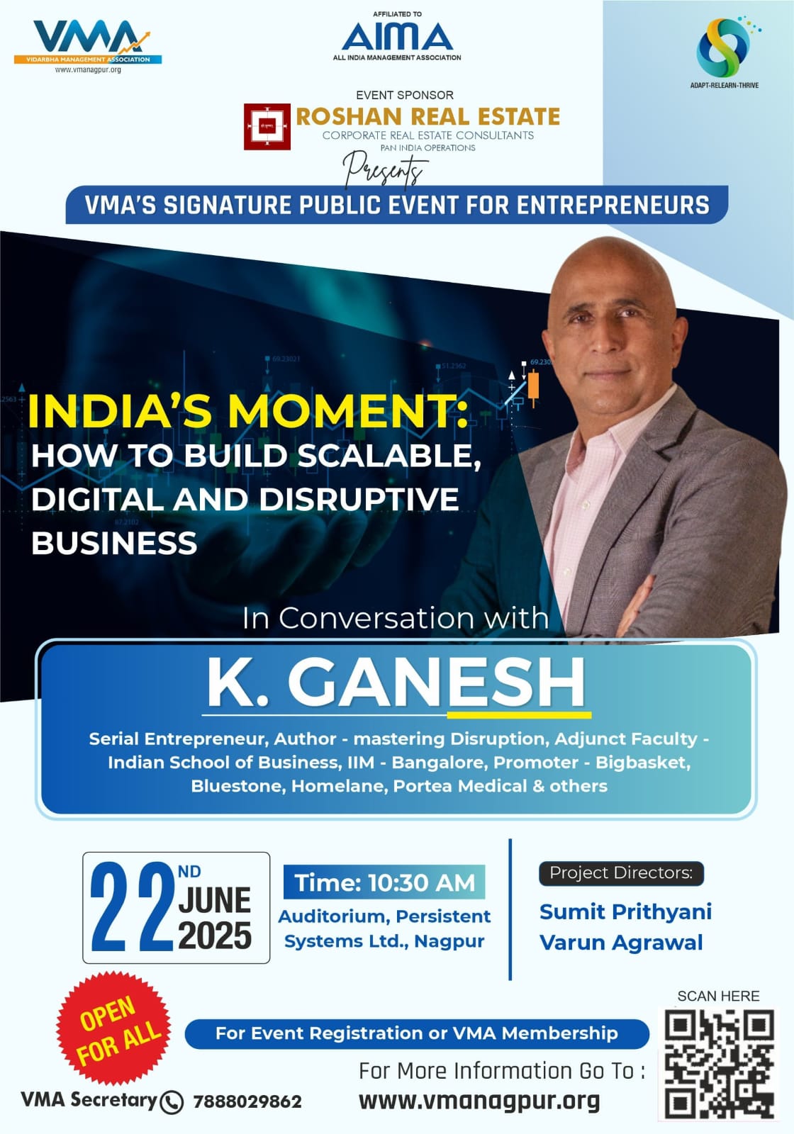 सुमित प्रीथ्यानी आणि वरुण अग्रवाल हे प्रकल्प संचालक असून सूत्रसंचालन युसूफ मास्टर करतील. या कार्यक्रमाला रोशन रिअल इस्टेट – कॉर्पोरेट रिअल इस्टेट कन्सल्टंट्स, ब्रेड्स एन बियाँड याचे सहकार्य लाभत आहे. याच दिवशी संध्याकाळी लक्ष्मीनगर येथील दि सेवन हॉटेल मध्ये स्टार्ट-अप शोकेस सेशन आयोजित करण्यात आले असून या कार्यक्रमात निवडलेल्या स्टार्ट-अप्सना श्री. के. गणेश यांच्या समोर त्यांचे पिच डेक्स सादर करण्याची संधी मिळणार आहे. इच्छुक स्टार्ट-अप्सनी व्हीएमए सचिवांशी संपर्क साधून नोंदणी करावी.
