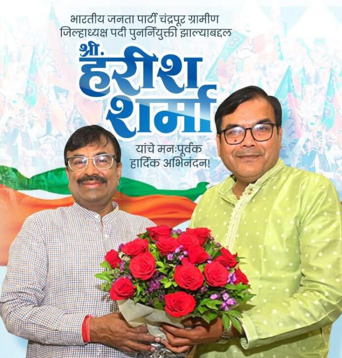 चंद्रपूर(chandrapur), दि.३१ : एकात्म मानवतावाद आणि अंत्योदय या तत्त्वांवर कार्य करणाऱ्या, जगातील सर्वात मोठ्या राजकीय पक्ष अर्थात भारतीय जनता पक्षाच्या चंद्रपूर जिल्हा (ग्रामीण) अध्यक्षपदासाठी नुकतीच नियुक्ती जाहीर करण्यात आली. या निवडीअंतर्गत श्री. हरिश शर्मा यांची पुन्हा एकदा जिल्हाध्यक्षपदी नियुक्ती करण्यात आली आहे.