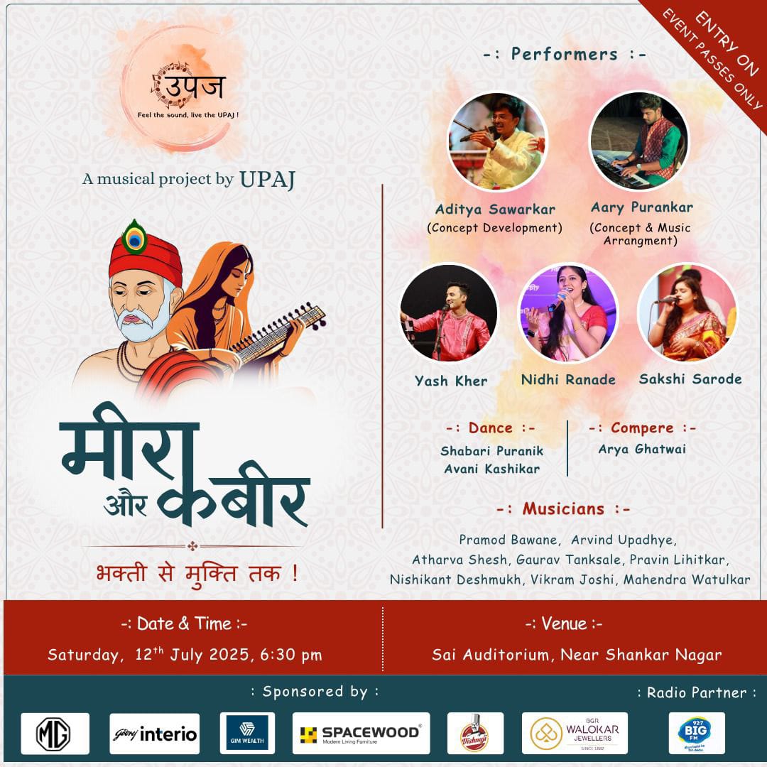 नागपूर(Nagpur)9 जुलै-भारतीय शास्त्रीय संगीताचा प्रचार-प्रसार करण्याच्या उद्देशाने युवा कलाकारांद्वारे स्थापन करण्यात आलेल्या उपज संस्थेच्या वतीने “मीरा और कबीर: भक्ती से मुक्ती तक” हा संगीत-नृत्याचा कार्यक्रम शनिवार, 12 जुलै रोजी सांयकाळी ६:३० वाजता शंकरनगर येथील साई सभागृहात आयोजित करण्यात आला आहे.