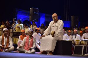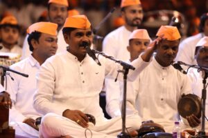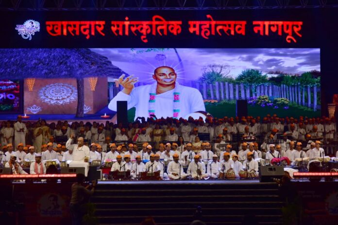 आधुनिक काळातील महान संत, समाजसुधारक आणि राष्ट्रीय एकात्मतेचे प्रणेते राष्ट्रसंत तुकडोजी महाराजांचे जीवन, समाजप्रबोधनाचे कार्य, ग्रामविकास, राष्ट्रप्रेम, साहित्य, खंजिरी भजन आदींवर प्रकाश टाकणारे नृत्य, नाट्य, भजन आदी लोककलांच्या माध्यमातून 2000 कलाकारांनी राष्ट्रसंताना अभिवादन केले. हनुमाननगरातील क्रीडा चौक येथील ईश्वर देशमुख शारीरिक शिक्षण महाविद्यालयाच्या पटांगणावर सुरू असलेल्या खासदार सांस्कृतिक महोत्सव-2025’च्या चौथ्या दिवशी सायंकाळच्या सत्रात वंदनीय राष्ट्रसंत तुकडोजी महाराजांच्या जीवनावर आधारित दृक श्राव्य संगीतमय कार्यक्रम ‘राष्ट्रसंतांची जीवनगाथा’ कार्यक्रम पार पडला. भगव्या टोप्या परिधान केल्या राष्ट्रसंतांच्या भक्तांनी परिसर भगवामय झाला होता.